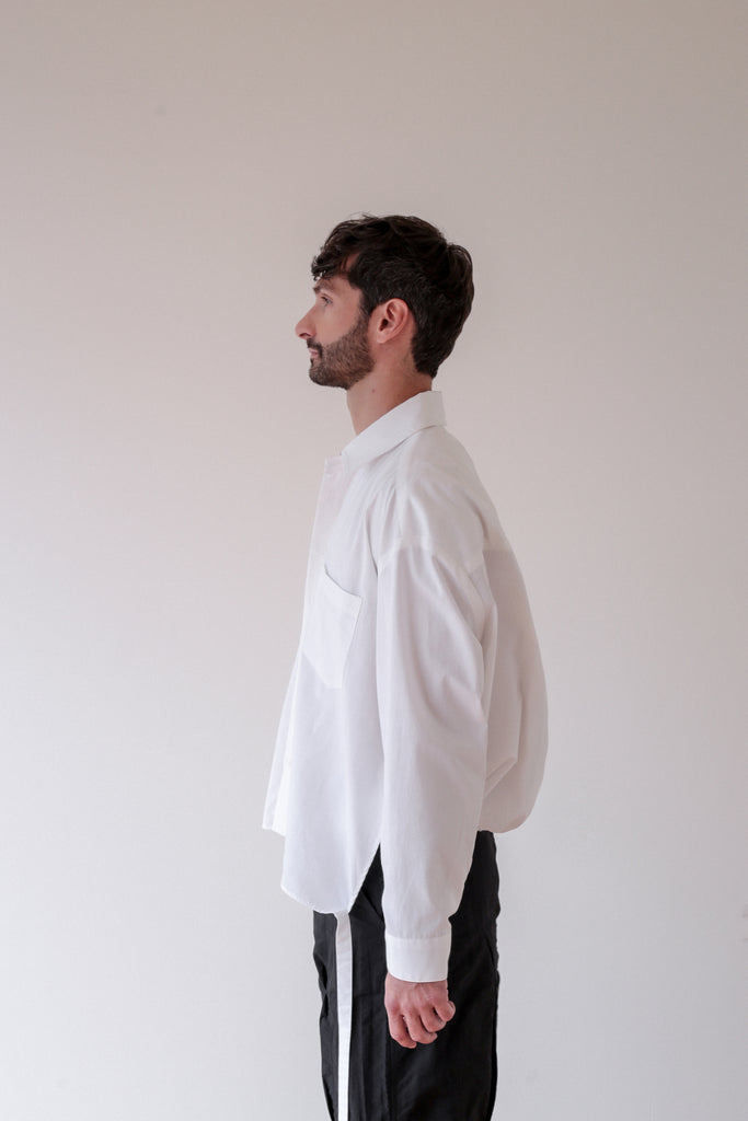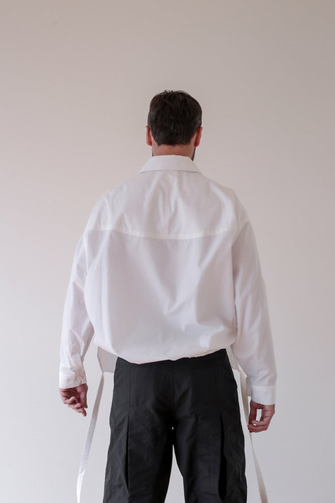 Camisa blanca manga larga oversize confeccionada en popelina de algodón. Cuello abotonado y manga larga acabada en puño con botón. Cierre frontal de botonadura. Y cuello desmontable.  Detalle de 2 bolsillos frontales, tiras al frente y resorte trasero.