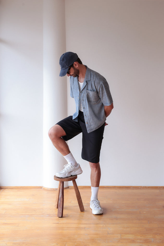 Camisa efecto denim corte crop confeccionada en tejido de algodón. Cuello solapa y manga corta. Linea frontal de botones metálicos a presión.
