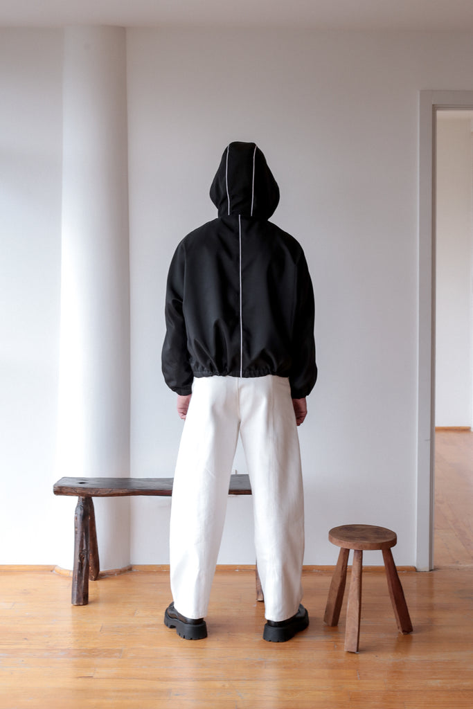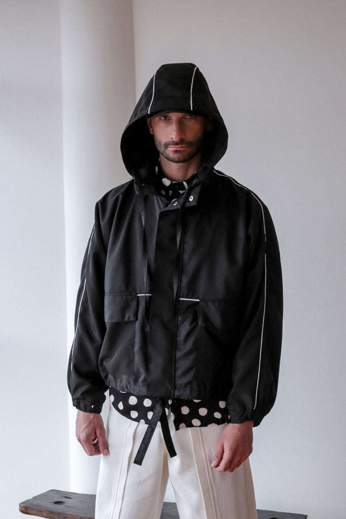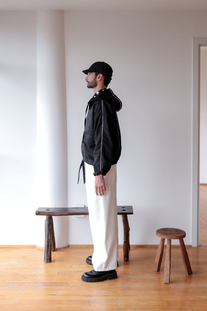 Chaqueta confeccionada en tejido técnico color negro con detalles lineas blancas y gorro. Manga larga acabada en puño con resote. Bolsillos laterales y cierre frontal con zipper oculto por solapa con botones a presión.