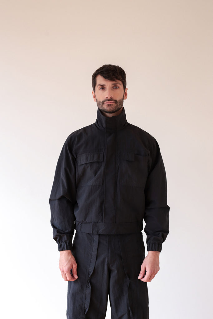 Chaqueta confeccionada en tejido técnico color negro. Cuello alto con botón. Manga larga acabada en puño con resote. Bolsillos laterales detalle de forro interior. Cierre frontal con zipper oculto por solapa con botones a presión.